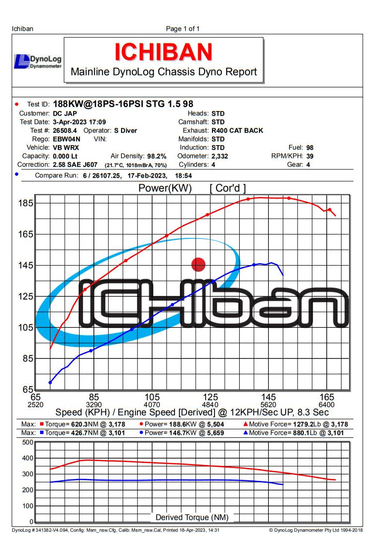 VB WRX MT Stage 1+ OTS Power Output (ICHIBAN Mainline DYNO)
