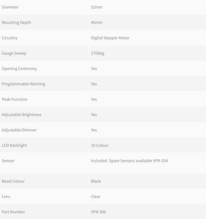 Raceworks gauges contain an analogue face, with digital circuitry. This means they are extremely precise and accurate in their operation, and no hoses/fluid lines need to be run into the cabin. They offer many motorsport oriented functions, all of which are accessed by a single button on the face. They are perfect for vehicles that don’t get used often, and may have the power killed completely in between infrequent drives, because all settings are hard coded into memory. They offer daisy chain wiring, meaning common wires such as power, ground and illumination only need to be connected to one gauge in a set, and a simple piggyback cable runs between each gauge. All Raceworks gauges are suitable for 12V applications only. Backlight colours are Red, Green, Blue, Yellow, Purple, Teal, Cool White, Pink, Warm White and Orange.